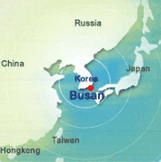 Busan Location Geographically, Busan has the Straits of Korea to its south; Ulsan to the north;Gimhae to the West. Cities that share almost the same latitude with Busan include Jinhae and Gwangju in Korea, as well as Tokyo, Jeongsen, Algiers and Oklahoma City abroad. Busan is eight hours ahead of GMT. As for its geopolitical location, the city comes at the Southern tip of a strip that connects Asia, Siberia and Europe. It also serves as a main gateway to the Pacific Ocean. This location places the city at the center of international sea transportation.